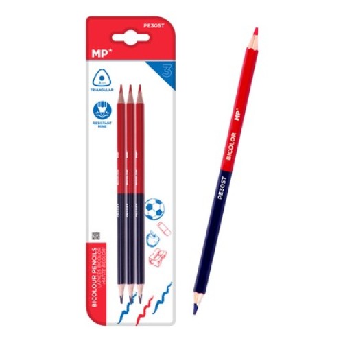MP ξυλομπογιά με διπλή μύτη PE305T, 3mm μύτη, τρίγωνο, μπλε/κόκκινο, 3τμχ